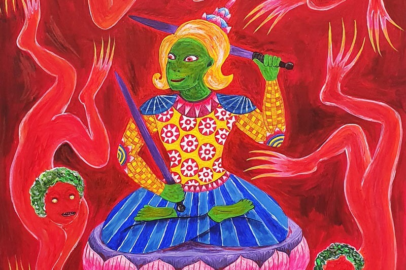 The paintings are based on the large murals often found in ancient Buddhist temples Thailand, which sometimes depict hell. In these new works, Vipoo centre’s himself as a deity fighting off metaphorical hungry ghosts.