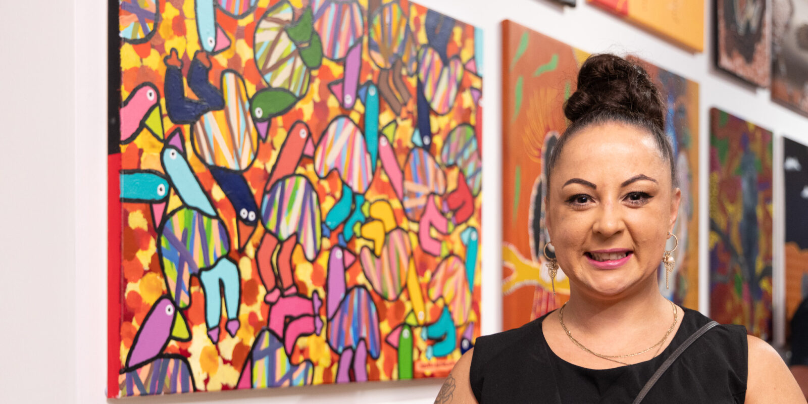 artist, she first started creating work with The Torch in 2016 and has developed a unique painting style using bold, often primary coloured