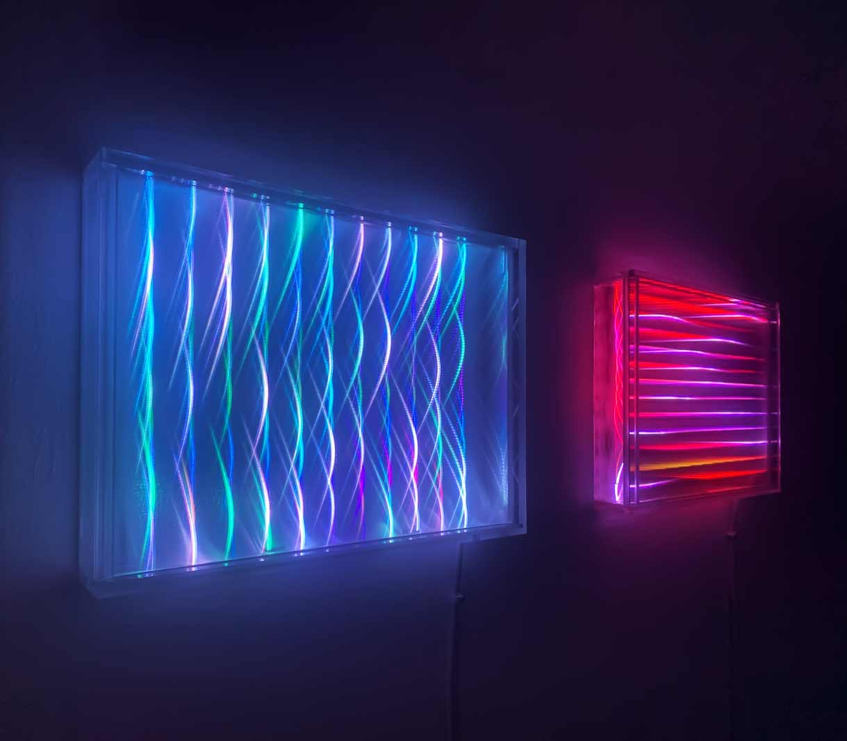 IMAGE > Jasmine Grace, <em>Ebb and Flow vertical</em>, 2021, lenticular film, acrylic, LEDs and custom electronics, 30 x 40 x 2 cm. Image courtesy of the artist.