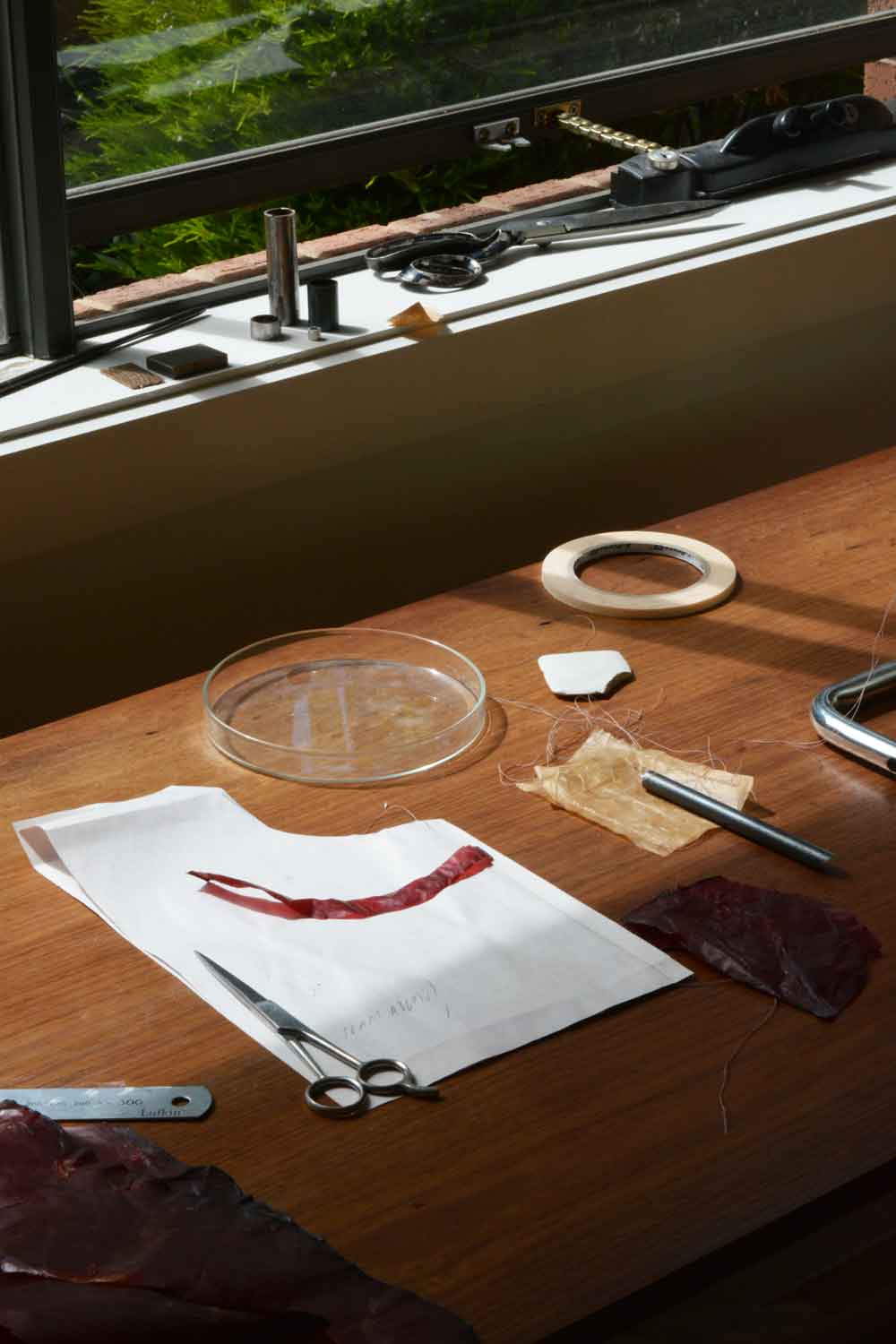 IMAGE > Jill Stevenson, <em>Baggage</em>, 2021, SCOBY leather, carved American oak and mild steel rod, 130 x 100 x 31 cm. Image courtesy of the artist.