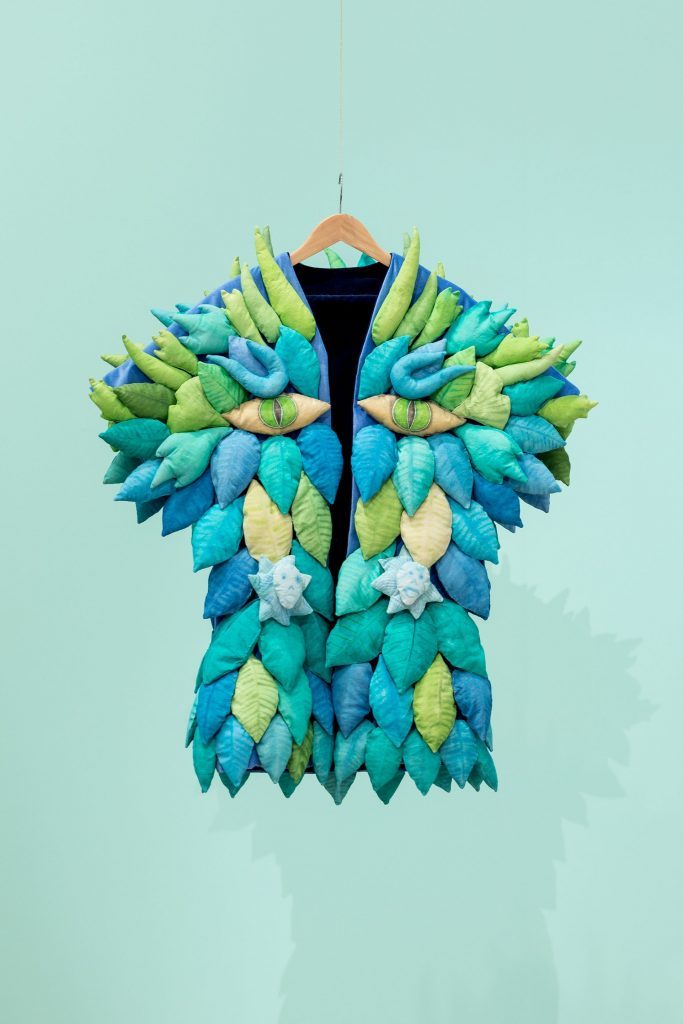 The artist has used textile painting techniques and repurposed materials to create a series of amulets and costume-like artworks. The garments feature botanical and talismanic symbols such as eyes, leaves, skulls, serpentine forms and scales. The artist feels that these works are imbued with healing and protective qualities. For Beynon, these soft-sculptural costumes act as offerings to the guardians while taking on a presence or spirit of their own.