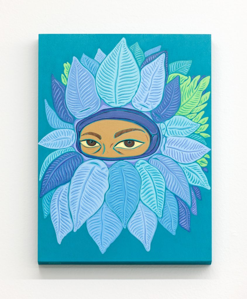 IMAGE > Kate Beynon, Studio Self in Blue Shaman Helmet, 2022, acrylic on board, 40 x 30cm. Image courtesy of the artist and