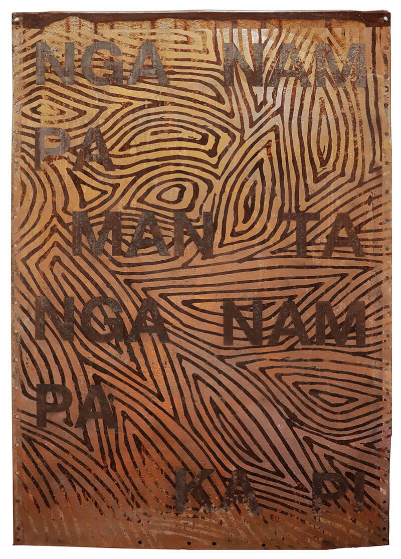 Robert Fielding, Kapi Waralpa (Distant Rain), 2019, rusted and sand-blasted water tank panel.