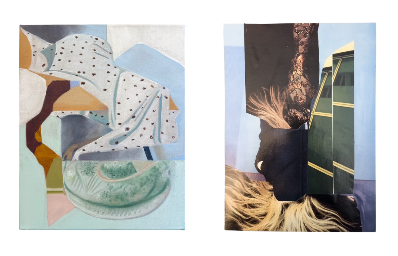 the notion of narrative, by presenting stereotypical fragments of contemporary lifestyle. The collages which the paintings are based on are